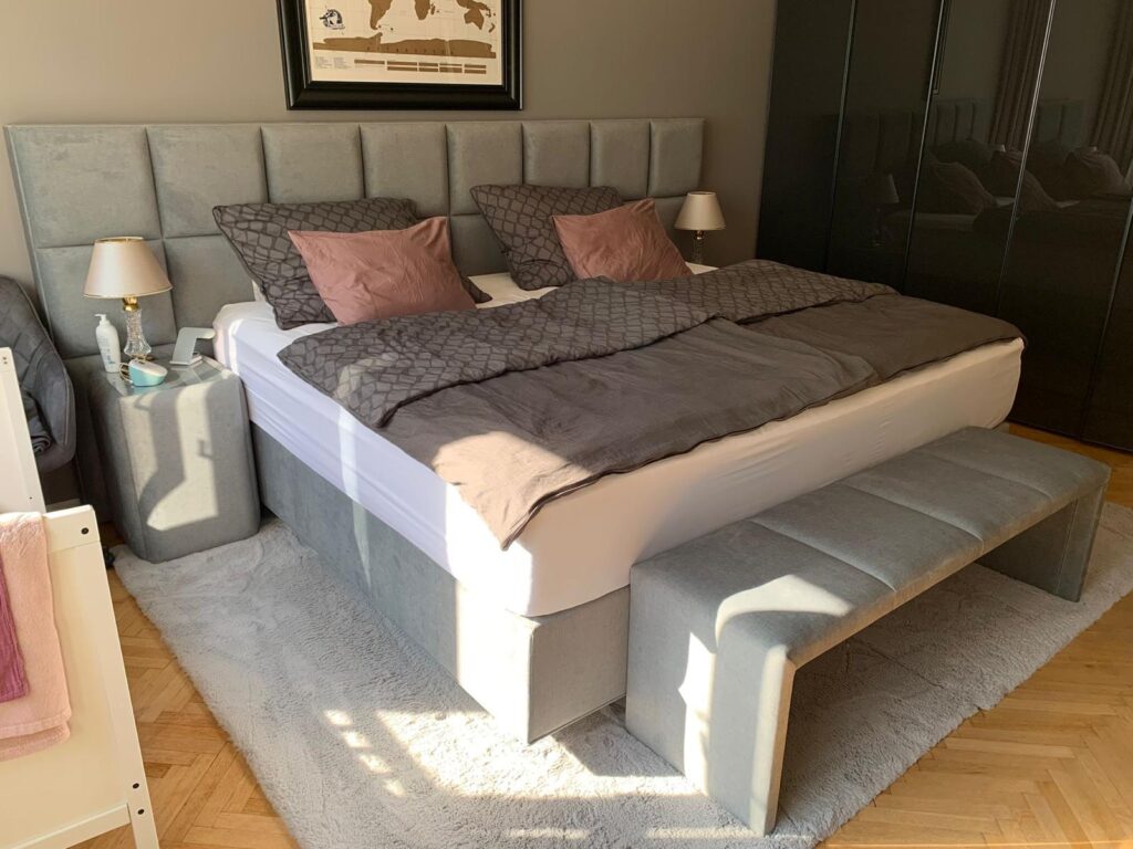 Ústředním bodem ložnice se stala postel Magnum – monumentální a přitom ladná. Čelo v impozantní šíři 320 cm a výšce 140 cm okamžitě přitahuje pohled a vytváří dokonalou dominantu prostoru. Jeho měkké linie v kombinaci s pečlivě zvoleným čalouněním evokují glamour třicátých let, zatímco precizní zpracování odkazuje na současný smysl pro dokonalost.